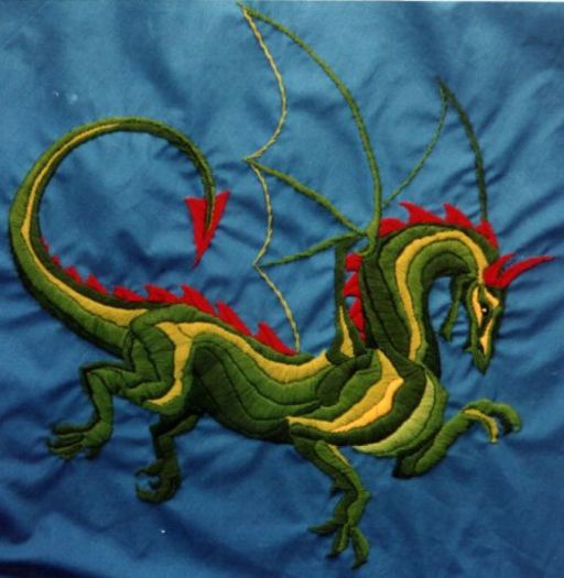 To save time I worked in coarser threads, but I think they're rather attractive in their own right. Breaking down color regions into strips thin enough for the satin stitch not to sag is one of my oldest techniques, developed before I had any formal training or exposure to standards and is still a favorite.