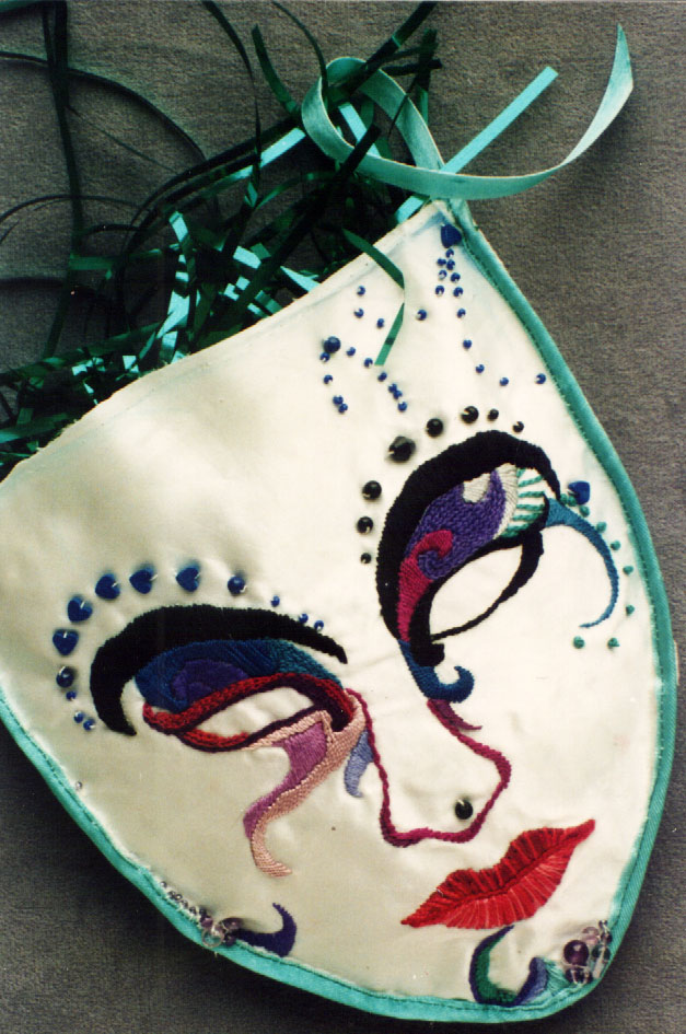 The earliest concept of my business card was for bead and textile art, not jewelry; and I made this mask for a show held in an Ann Arbor gallery now long defunct. The edge of the piece is not particularly well finished, and I didn't put a great deal of time into it; but I felt a little sorry for some of the other maskmakers, who waited a very long time to get their gorgeous pieces back. Though absolutely useless except perhaps as a wall decoration, I'm rather fond of this piece, which measures perhaps 6” across.