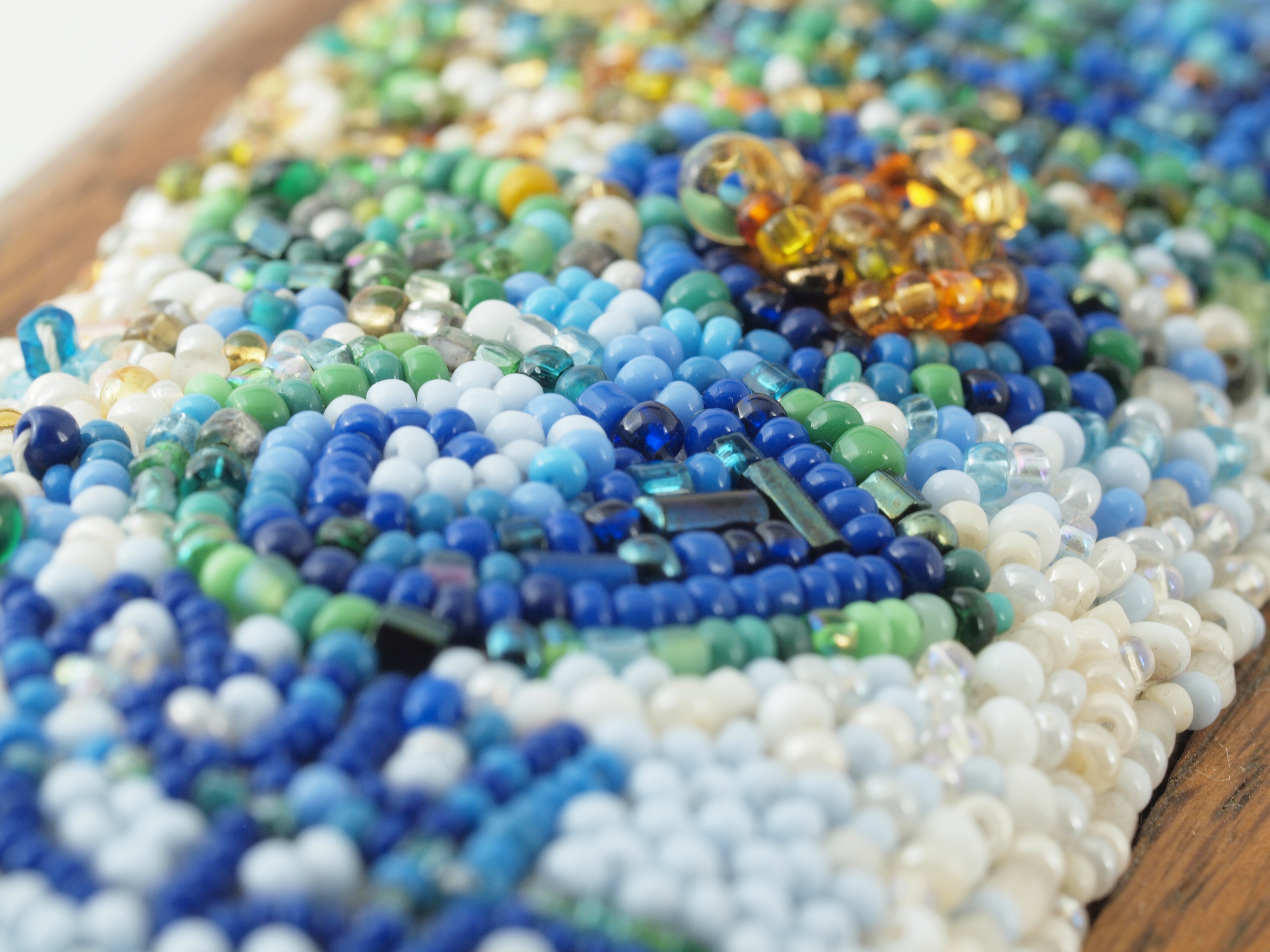 The piece incorporates several techniques Laessig covered in her class: straight lines of beads; curved lines of beads; random "seed stitch" of beads; and a sort of dimensional curved stitch reminiscent of bullion stitch (the part in the middle with the 8/0s). As it was a sampler, it seemed perfectly appropriate to work my name into the piece, which I did in smaller 13/0s.
