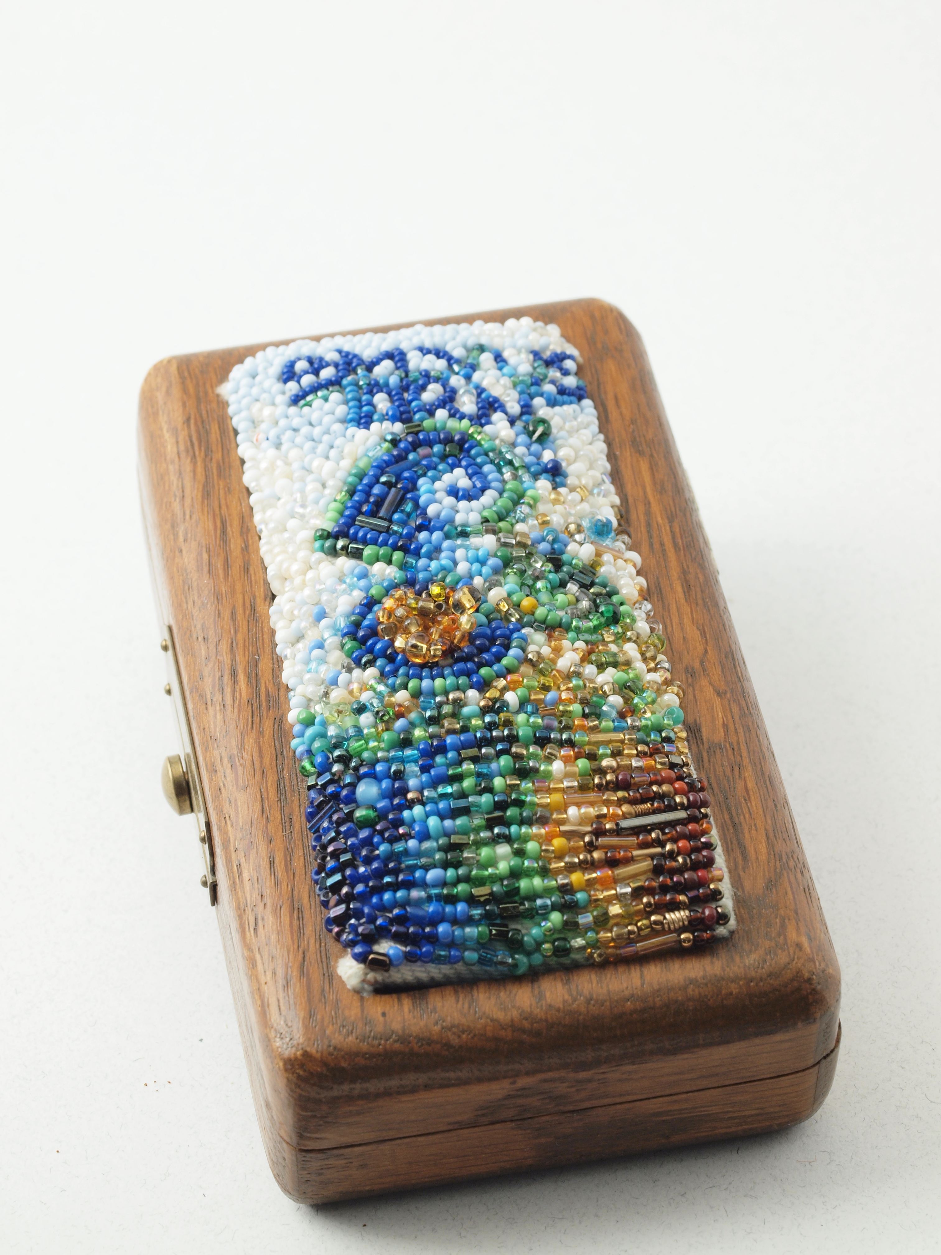 wooden needlecase with embroidered insert. denim, nylon? thread, assorted seed beads. Overall dimensions: 2-3/4 x 4-3/4 x 1-1/2” Embroidered panel, 2x4". early 90s?
