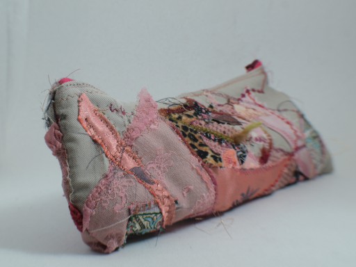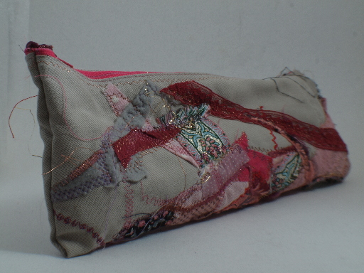 This piece started out as another piece of applique from the 2006 series I mentioned last time. Like the other pieces in the series, it includes a piece of scrap silk from my 2004 trip to Viet Nam, animal prints—leopard instead of tiger, this time—and fancy brocade ribbon scraps.