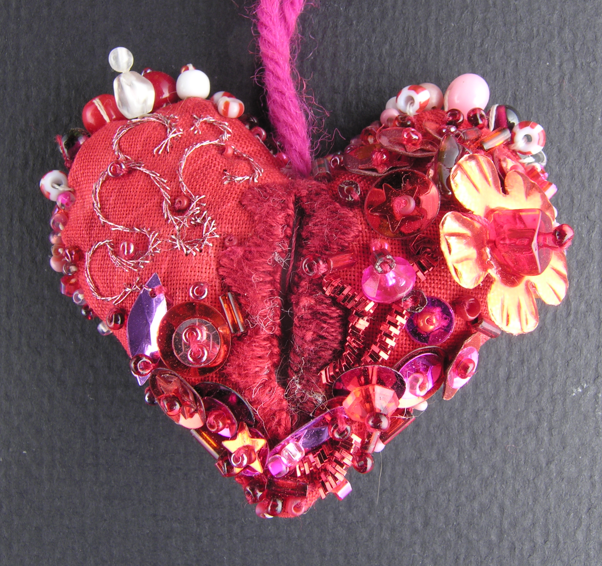Cotton fabric, beads, thread, sequins. Perhaps 2–2.5 inches at widest point. Photographed 16apr2006. Page made 13sep2015, & finally gone live 14feb2018...