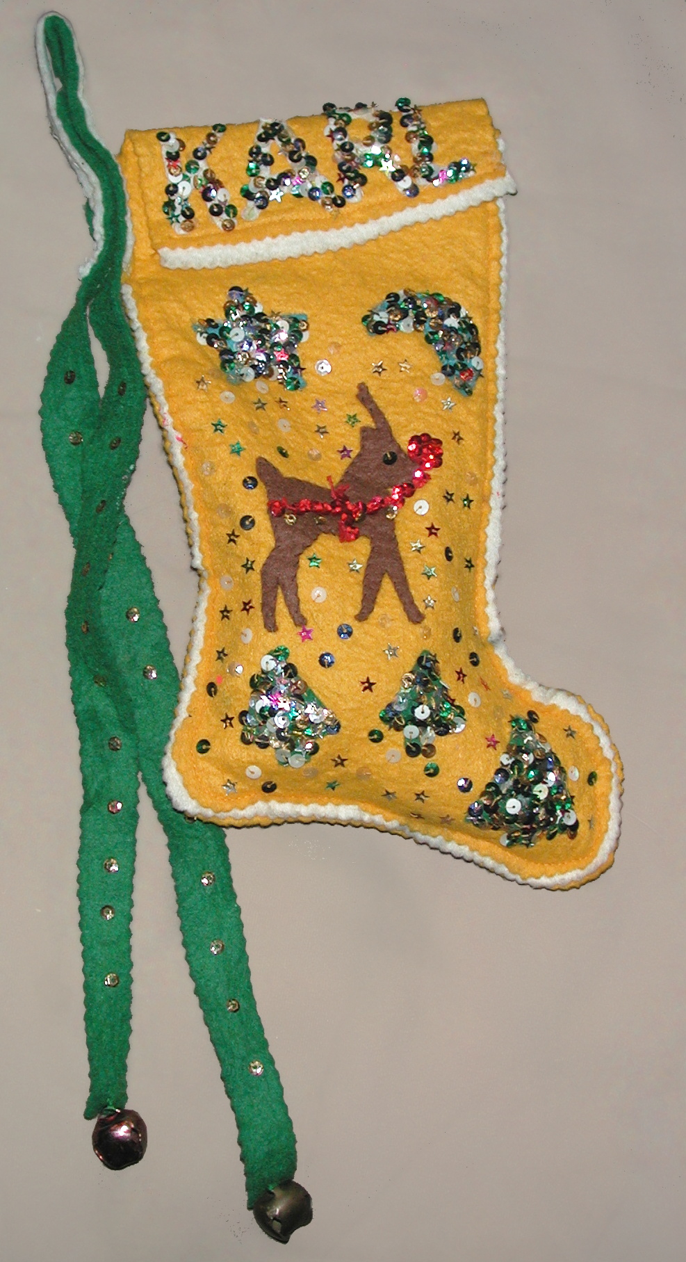 Reindeer stocking. Felt, sequins, jingle bells. Photographed 25dec2002; manufactured late 60s/early 70s. With yet more of my fridayfugly level of image editing.