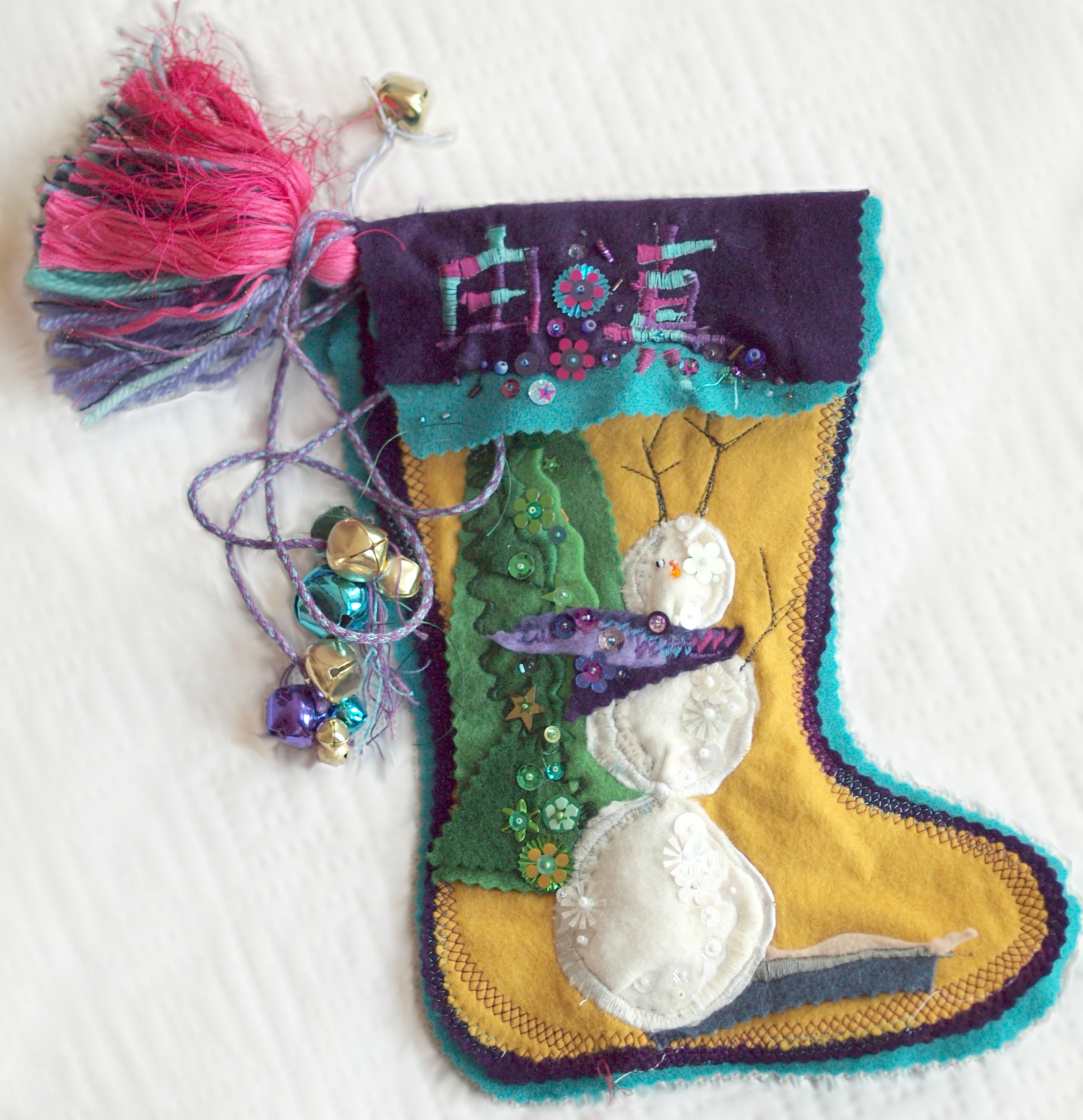 felt, sequins, jingle bells. Photographed 2002. Probably made in the mid to late 1930s. It's held up pretty well for something 80 years old.