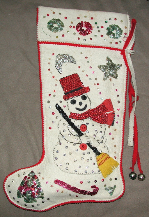 This one is probably made with genuine wool felt! Certainly it's much better quality fabric than one can typically get now. It's also considerably larger than the others. However, the idea for JDftY3’s stocking actually came from a snowman she and host sibs made: