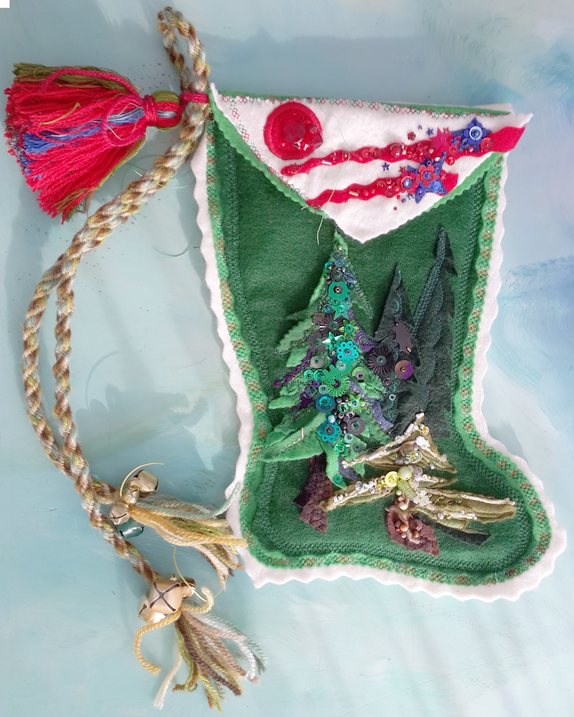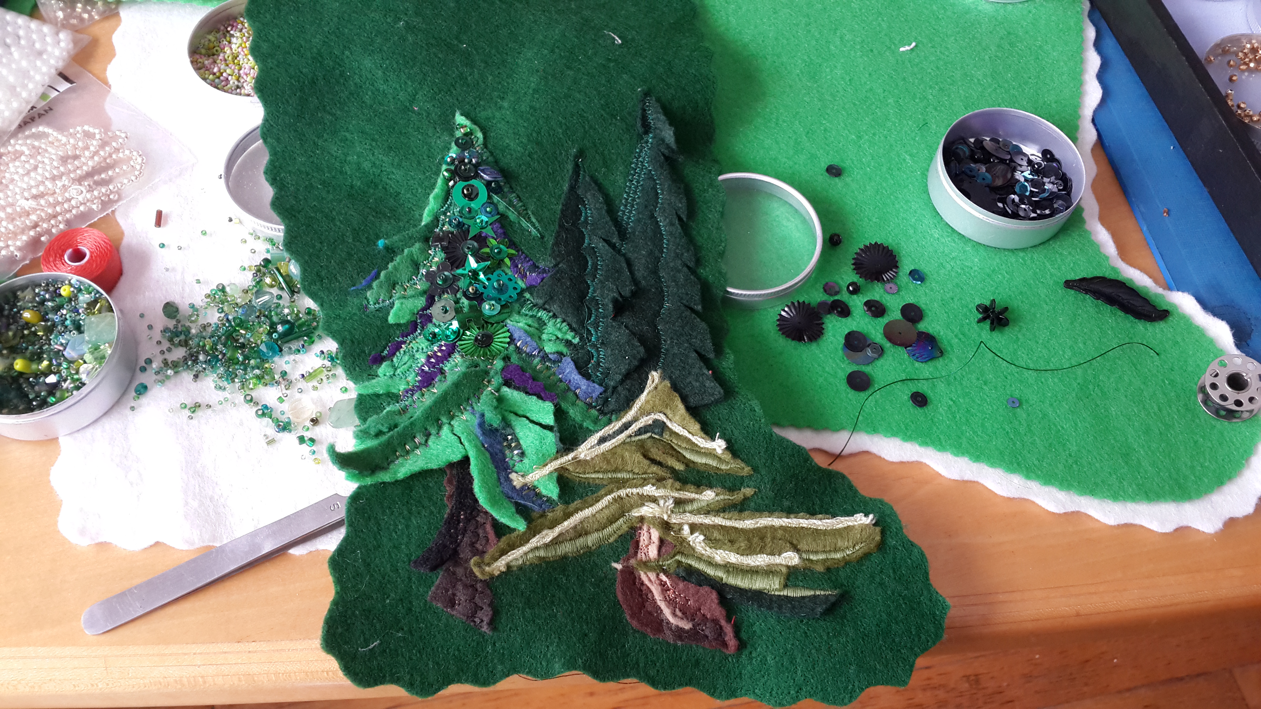 Note also that westerners tend to shift vegetation to a blue cast that isn't very realistic; trees in nature are not emerald green! I had to work pretty hard to pop the Japanese tree forward in the composition, which I did by using dark sequins on the taller tree, and plenty of nice contrasty white (representing snow) on the Japanese tree, which has a bent trunk to symbolize its greater age (and thus ‘stature’).