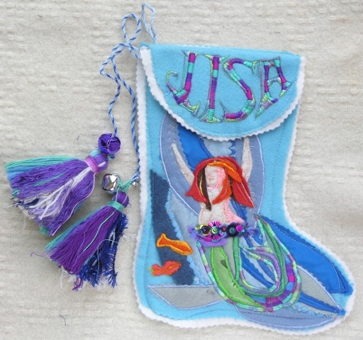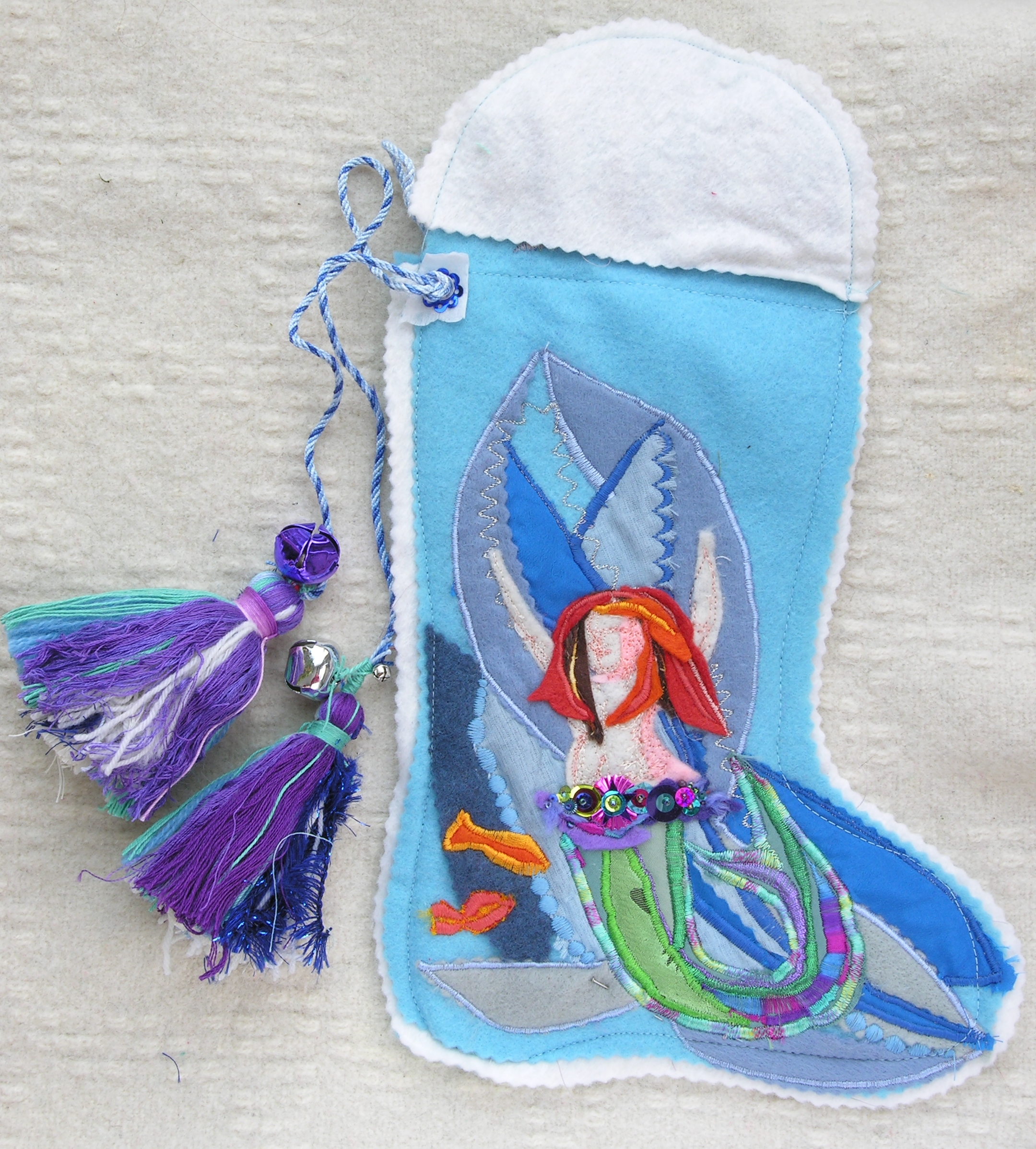 I just love these multicolored threads in the name, but I don't know that this is perfectly successful, though you can see I tried to tie it into the rest of the piece, especially the mermaid's girdle area.