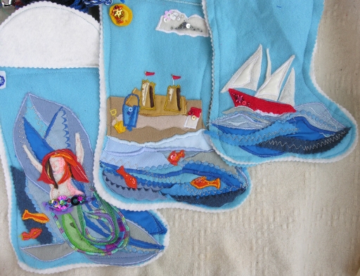 Three sea-themed stockings; I did in fact plan the water lines in each so they'd line up, as in this photo.