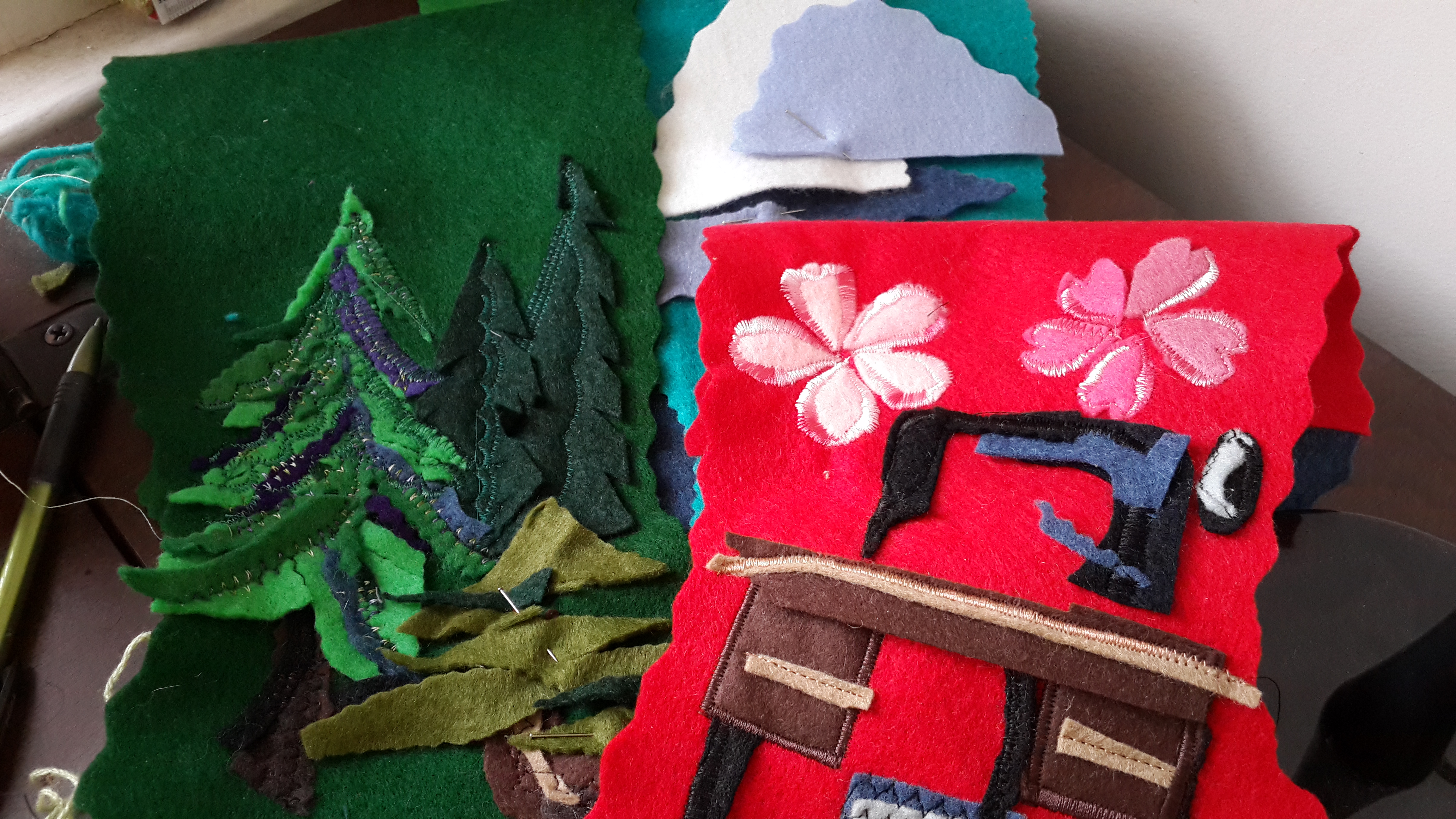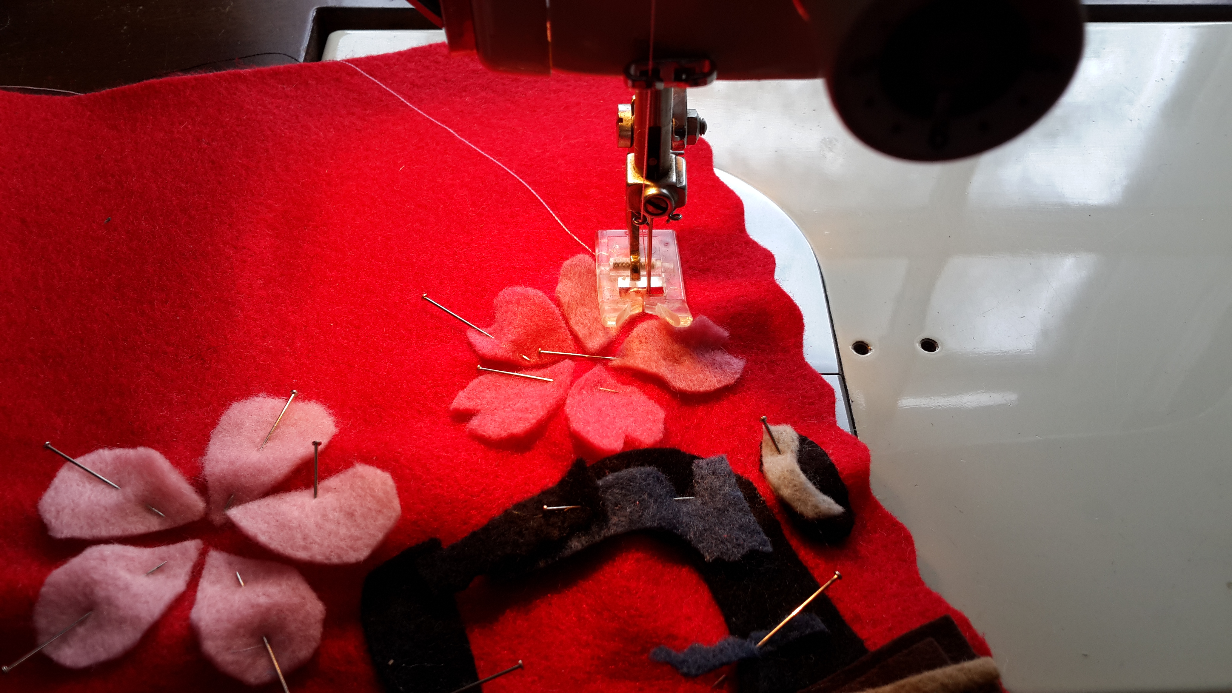 In progress. If I ever learn to use wonder under I'd like to go to a freestyle sewn applique, but in the meantime, I use pins to position the pieces.