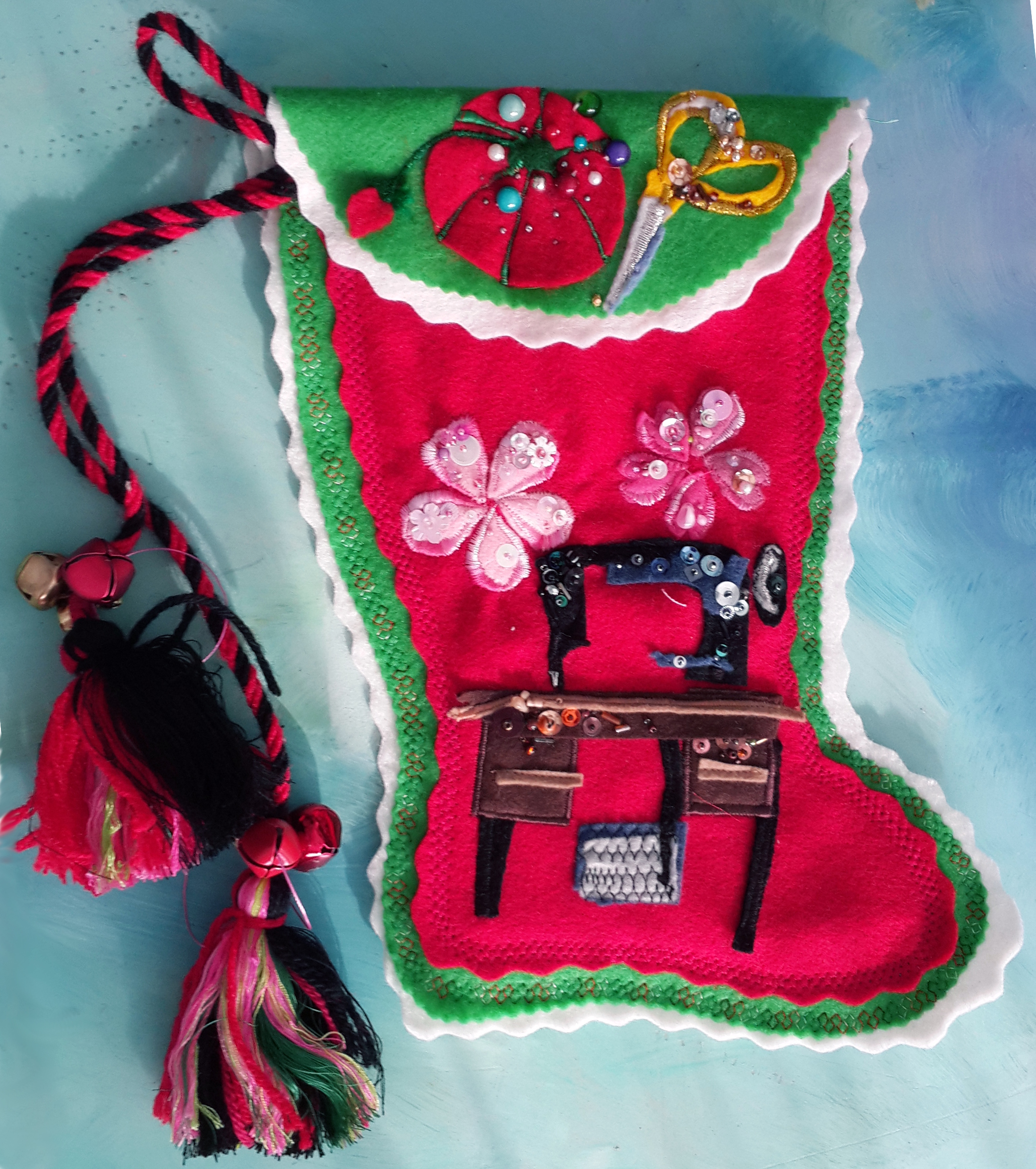 Finished stocking. Shows the bradshaw wound cord, tassels with jingle bells, completed applique, and embroidery, including those fiber optic beads that are just perfect for pinheads.[1]