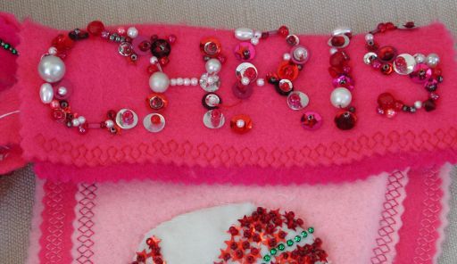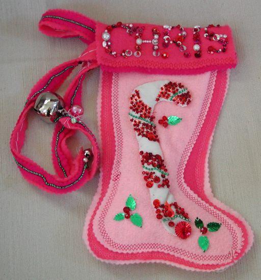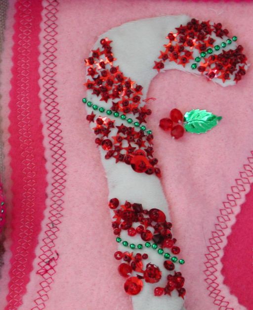 This stocking was made to match the blue one, below. It's had a rough life. Dogs love chocolate, and a dog chewed the original version up because a piece of chocolate got left in it. Fortunately the dog wasn't hurt, and I had more felt, so I simply remade it, reusing the most time consuming part, the candy cane.
