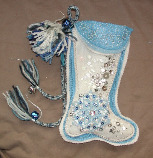 Initially I was very unhappy with this piece, because I didn't feel the snowflake came out well. It's grown on me; the real difficulty was that it didn't come out the way I imagined it. One of the joys of making these things is that folks more or less have to take what they get, since they're gifts, not commissions. At the same time, I try to “fit” the stockings in some way to the recipients, which gives me a starting point—the best of both worlds. As the recipient is very tidy and precise, the geometry of a snowflake turned out to be a good choice, so everything worked out well.