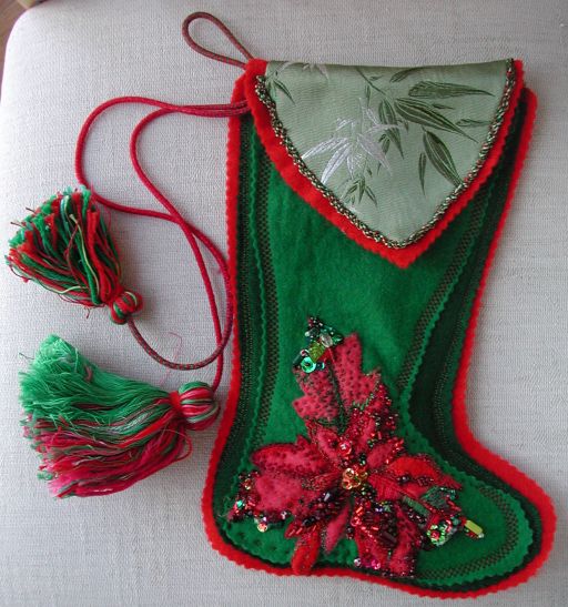 Originally, I planned to make two additional stockings, with white and pink-spotted poinsettas, respectively. (I still may, someday...:) I figured this might replace my childhood stocking, which is wearing out, or perhaps go to one of my parents. My mother finally accepted it as a gift this year. She not into totskches, so giving her stuff is extremely difficult.