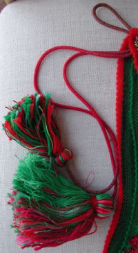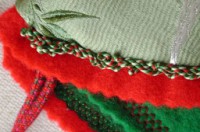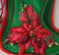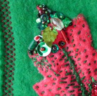 This is a closeup, showing the beaded embroidery appliqued upon the felt. Part way thru the project I purchased some good quality red felt, which really points up the thin color on the older red felt. Click on the thumbnails for a 512 pixel wide enlargement.