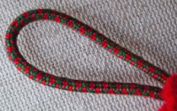 I like tassels that have fine fibers in them, as these do. Note the asymmetrical distribution of thread colors. I consider this piece of kumihimo to be the most successful I've ever made, at least with ombre (hand-painted) fibers, in which I attempted to get the ‘twisted diamond’ patterns to show up (green) and sink back (red) into the background.