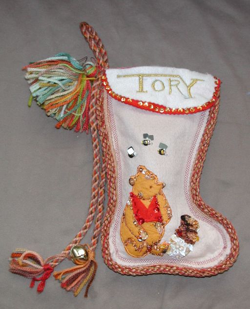 This stocking has a couple of features that are new to my design process. I used metallic thread and and a sewing machine to embroider the name, and appliqued the large figure with machine satin stitch. Wanting a somewhat unusual color for the background (cream felt), which I purchased at Haberman's, hoping to get a somewhat better quality, I also (on impulse) bought a scrap of upholstery trim. I might have made the braid to match, but I'm pretty sure they co-ordinated just by coincidence. At any rate, I think the hand and machine made cords look pretty spiffy together.