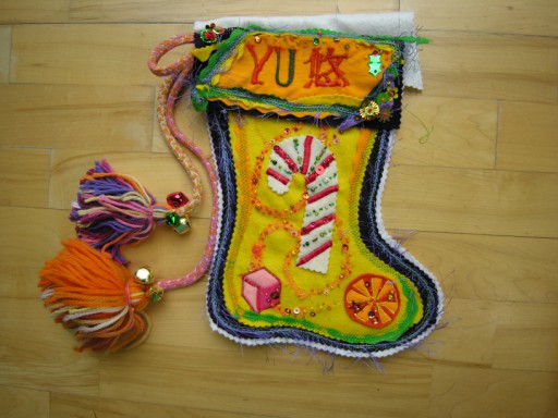 Given the candy-cane, perhaps it's a reference to this earlier work. This particular stocking is in an extremely loose style, and probably one of the most playful I made: on the one hand, it's messy, with threads dangling everywhere, and casually stitched down; on the other, cords are very popular linear elements in Japanese embroidery, so I threaded one through this design; and of course, the color scheme reflects the owner's fondness for yellow (the green and purple were my idea, of course...)