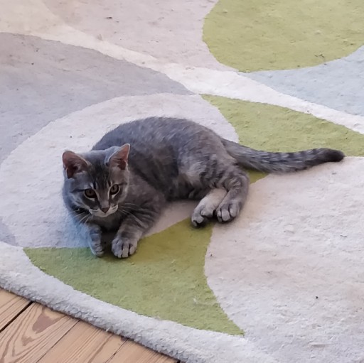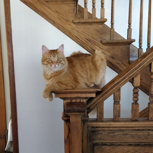 If I were just a touch less lazy, I'd use gimp's skew tool to straighten that left edge but just as is I love the way the geomentric background of the stairwell co-ordinates and sets off the cat's similarly coloured fur.