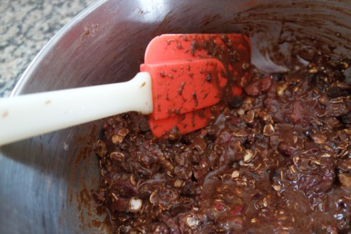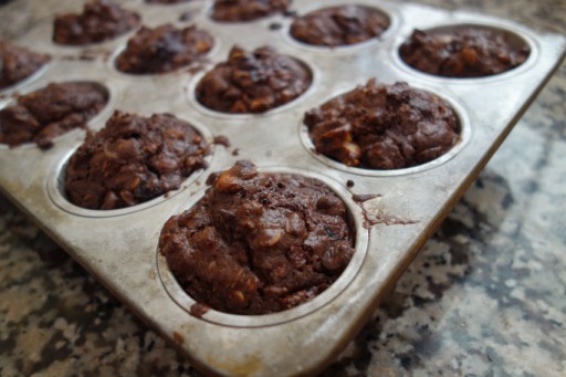 Comments: Normally I love the crunchy texture the oatmeal gives muffins. I didn't like it with these, because I was going more for a cake-like texture. Another T (or even 2!) of sugar probably wouldn't go amiss. I also considered swapping out some of the chocolate chips for dried (chopped) cherries. One way to keep the chocolate but increase the cherry flavor might be to blenderize the frozen cherries with the egg and oil, leaving 2-1/2–3 C of “dry” ingredients slots open for chips, dried cherries and nuts.[1]