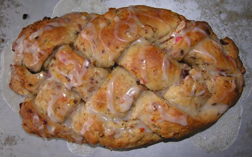 At any rate, since I'm agnostic, I'm not especially worried about Christian symbolism, and I doubt my mother (who is Catholic, albeit technically a heretic) did either. What she liked about the recipe was the fact that it directed the candied fruit be chopped very fine—she felt the big chunks called for in other previous stollen recipes she encounted less than appealing. Think fruitcake, with its big wodgy chunks of sugary chewy gummy-bear (ugh!) consistancy fruit, and you'll know what I mean. (In fact, I bet fruitcake could be made 100% more appealing by cutting the fruit in that smaller, too.) Since chopping stuff up fine is my favorite thing to do in the kitchen, to the point that I actually have to discipline myself to chop coarsely, this recipe is a natural for me.