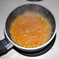 Cover the peels with water in small saucepan and bring to a boil. Pour off water. Although the original recipe recommends doing this 5–6 times, I do it only once, to remove (I hope) any lingering pesticides on the peels. Then add (roughly) an equal volume of sugar to the peels, and 1/4–1/2 c water to dissolve it in, bring to a boil. The idea is to boil away the water without burning anything, so after most of the water is gone, turn the burner down from high to simmer, until the resulting mixture is thick and viscous. 1 C peel yields enough orange peel for two batches, and it keeps a long time in the fridge.
