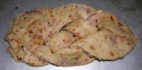 I tend to make this bread in the winter months, and I'm cheap (ie I have the heat turned down to 55–60 deg F), so I've found a trick to make this stuff rise, since sometimes it doesn't, even over a period of hours: I have an electric (the horror) oven, which I find if I turn just till the knob ‘clicks’ will give me the perfect 90 degree temperature for raising yeast. A warming drawer or a pan filled with boiling water in a closed oven are supposed to also work. Let rise till double (till a plunged finger leaves a indent, instead of springing closed) punch down, and roll out to about 3/8 (10mm) thick oval.