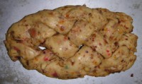 To braid: Slice into strips roughly 1 to 1-1/4” (25–30mm) thick, leaving a half inch (12mm) join at one end. Consider the strips as being number 1 – 5 (or three or 4 or however many you have, but usually 3–5) from left to right. Lift the left most strip (1) and lay it cross wise along the next (2) just below the cut. With your right hand, lift (3) out of the way, laying (1) over (4). In other words, you're weaving the strips over-under-over, using the left-most strip as your weft, the remaining strips as the warps. When you've got (1) completely woven, (2) is now the left-most strip, so you continue the same process, except it starts out going under (3) instead of over it. Continue till the strips are braided, and stick the ends together. Note that your bread has ‘traveled’ 45 degrees to the right.