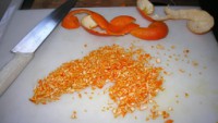 If you'd like to make your own orange peel: while the sponge is increasing, wash the orange (or grapefruit or other citrus) peels. Using a large sharp french knife, slice the peels into strips 1/8 (3mm) thick. Clementine peels are ideal because they're so thin, but you can use any kind of citrus peel, though I like to slice away some of the white pith on particularly thick peels. Cut crosswise into bits no more than 6mm long.