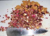 While you're waiting for the peel to boil, you can start chopping the citron, dried fruit and dates. If you don't have or can't get citron, just substitute more candied peel, —mixed half and half with marachino cherries, if you happen to have them on hand. For the stollen in these pictures, I substituted 1/2 C korean red dates (which aren't that great for eating, but surely stick to the knife less than deglet noors, which gives ’em my vote for cooking) and 1/2 C dried (sweetened, sigh) cranberries for the raisins.