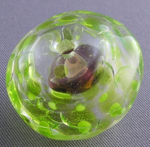 Take this demo bead. Aside from the wretched color combination (yellowish green glass is too close to being purple's complement, especially given that the standard manganese purple is already on the brown side, and now it's even duller) the scum and the bubbles, some how or other a rod of bullseye obviously sneaked its way into the effetre; either the clear or the green.