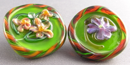 You know the old joke about duct tape: what's light on one side, dark on the other, and holds the universe together? Well, at first gasp, these buttons aren't too bad, excepting for the punty scar on the left (that honking big bubble filled hunk of clear) not to mention streaks of poorly cased pea green on the right. The button the right is actually pretty sweet...