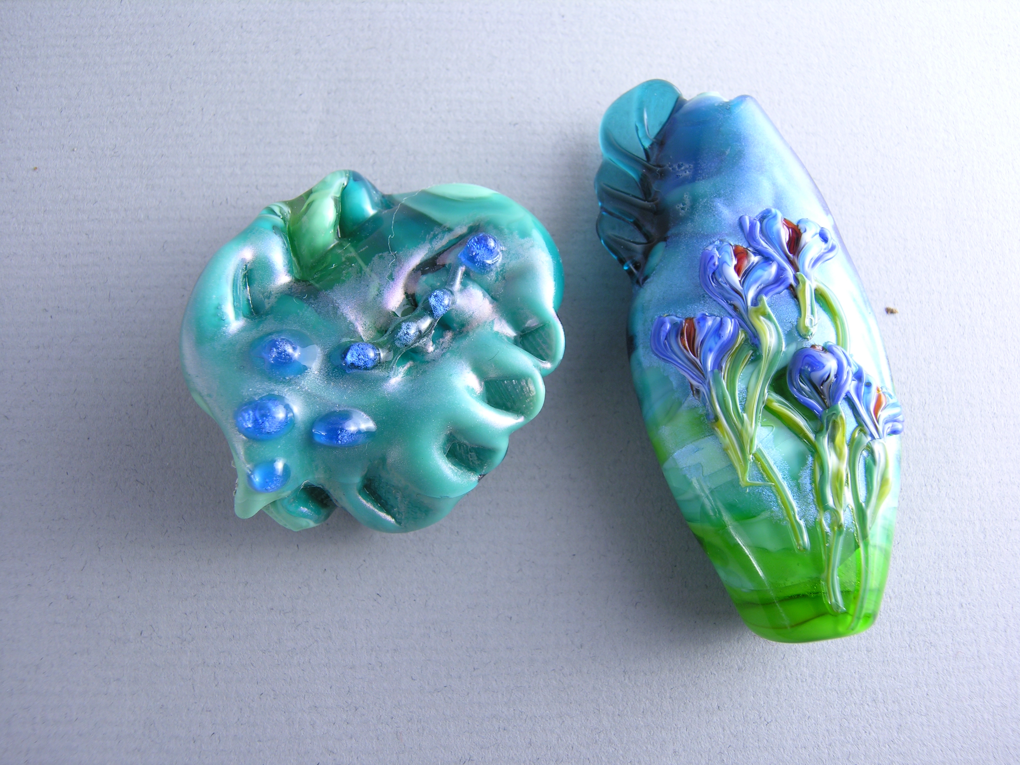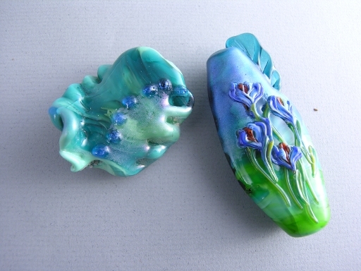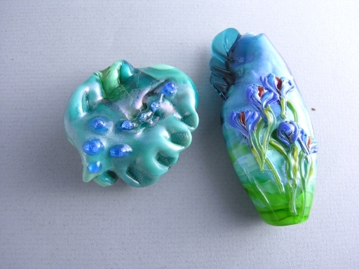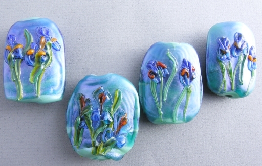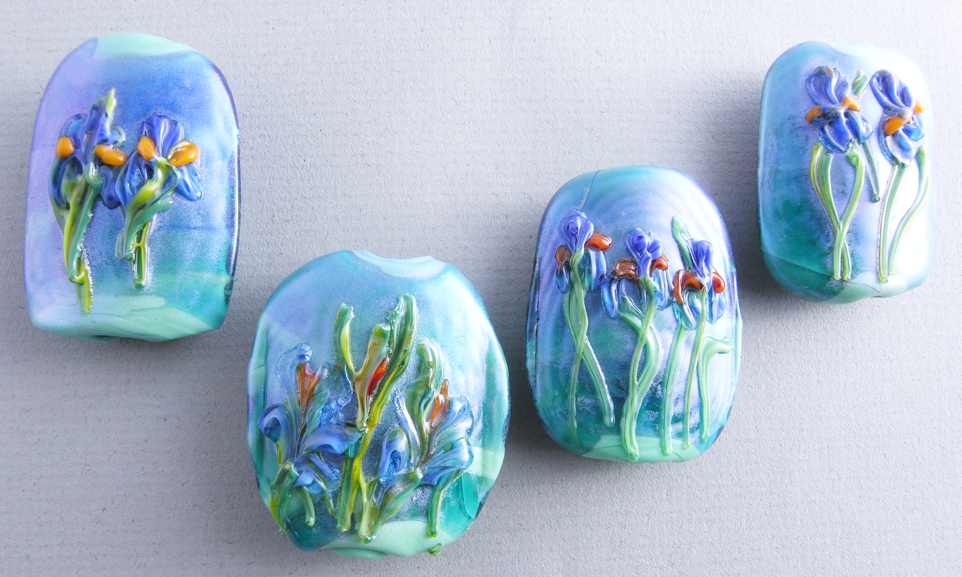 and the reverse... these beads are first attempt at genuine bearded iris. The fattest is sort an intermediate effort, and very odd looking it is as a result, too—though I like the transparency of the petals.