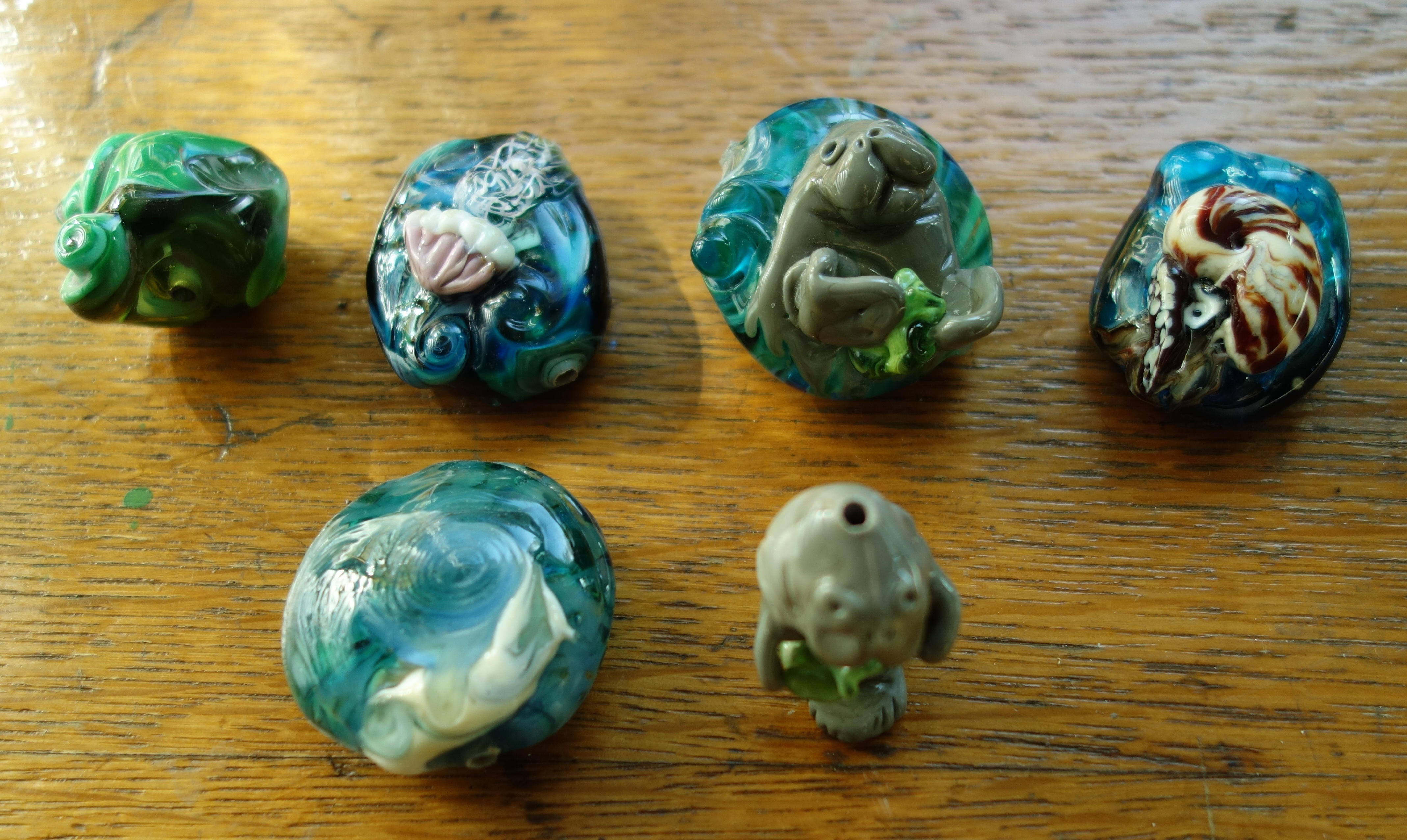 L to R: nugget, jellyfish, manatee, nautilis, from day 1. CiM & effetre. The beads in the second row were ‘extras’ of the class assignments.[2]