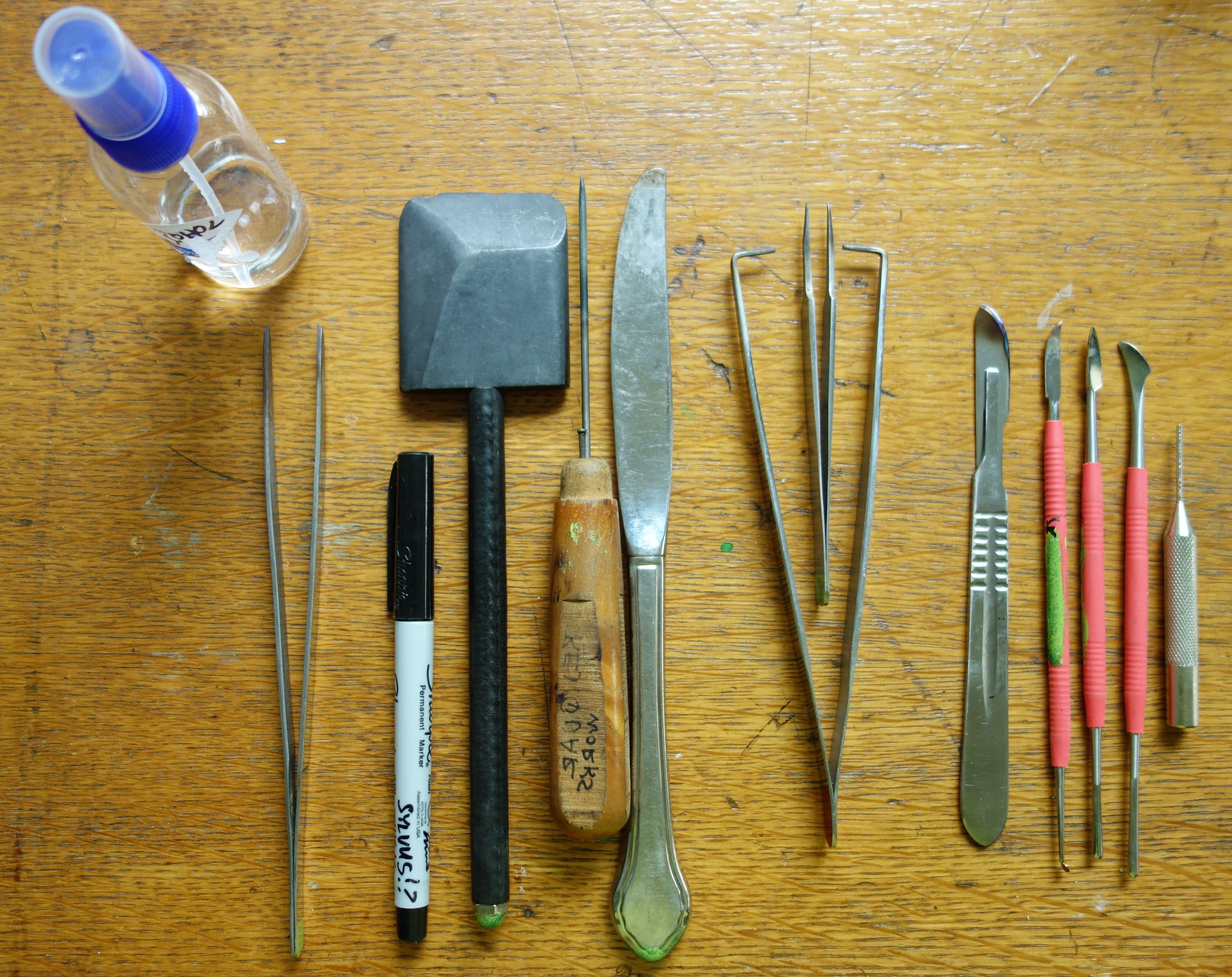 Tools needed/used for this class, from l to r: alcohol, pointed tweezers, sharpie, graphite stump shaper, tungsten rake, butter knife, peters tweezers, no. 5 forceps (aka knotting tweezers). The 5 tools on the right were specific to the class.