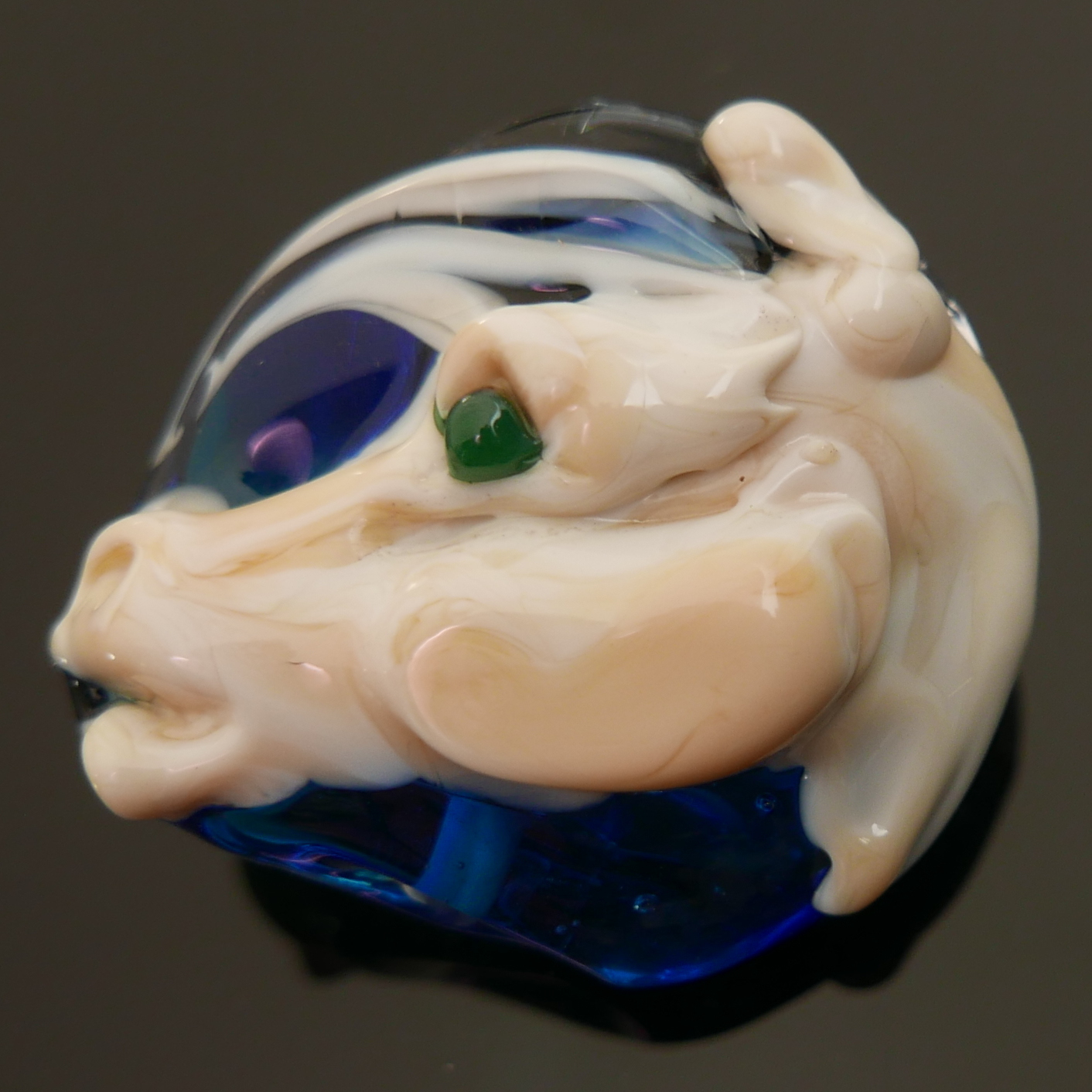 So after copying the Goldfinger, I picked a photographic model[5] I made a careful full-size and over-size sketch, went back into the studio, warmed up with some dot and gravity beads, even a couple of bead curtain horseheads in clear glass that went reasonably well, and attacked the assignment, a Munshower style opaque horse head, but simplified.