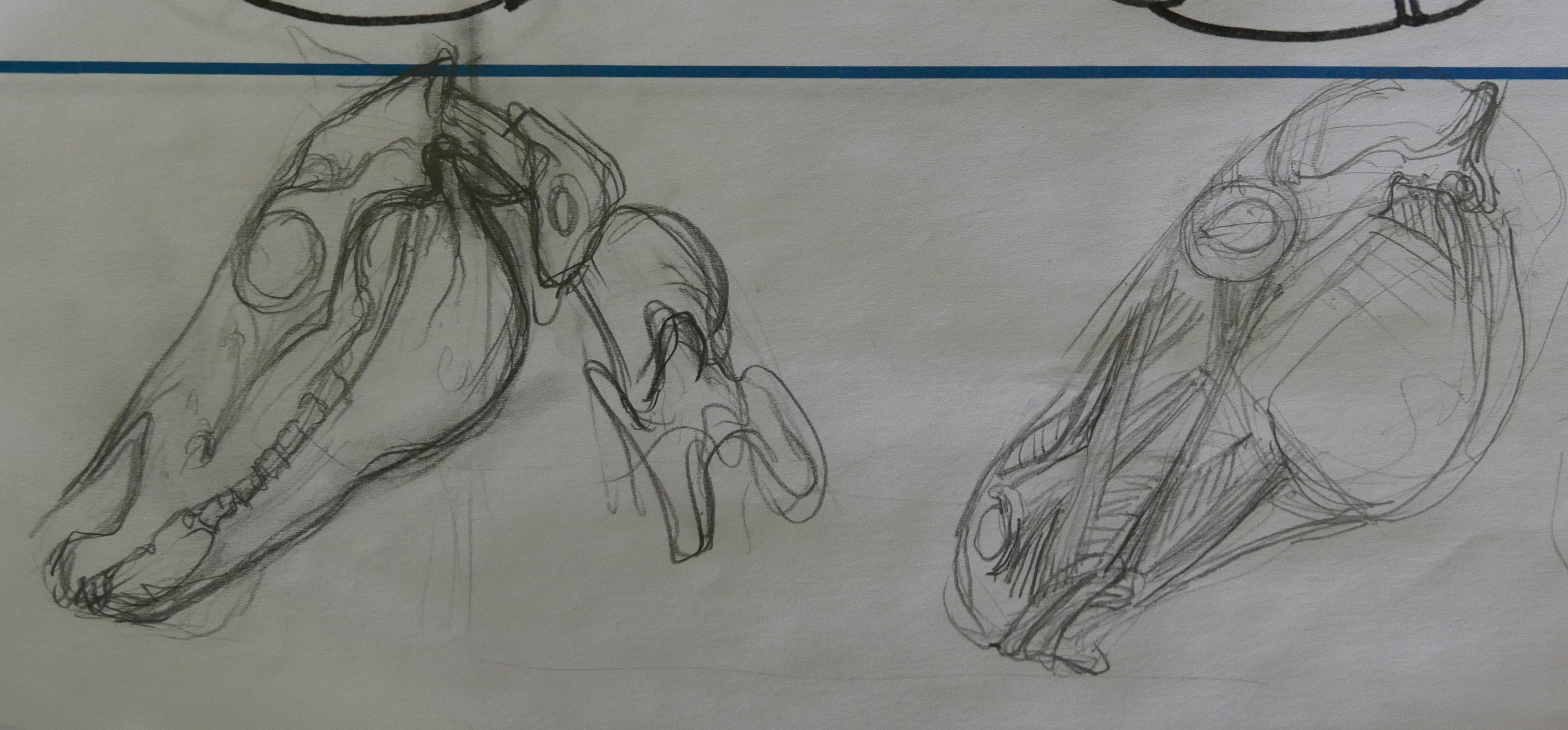 Drawing after horse skull, left; sometime between 2015 and ...2019? (more likely much sooner); musculature after Goldfinger, 12 or 13apr20.