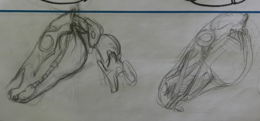 But, then, as I explained last time I got interested again, & spent a frustratingly long time looking for the folder (before finding it where I dimly remembered putting it—let it never be said that I'm necessarily good at seeing what's right in front of my face); then, after my (extremely) moderate successes, I decided it was time to really dig into horse anatomy, past what my class notes provided. I'd obviously meandered down this road before, as shown in the sketch of a skull I made awhile back: understanding the underlying skeletal and muscular structures is essential to successfully doing realistic drawings of animals with both.[1]