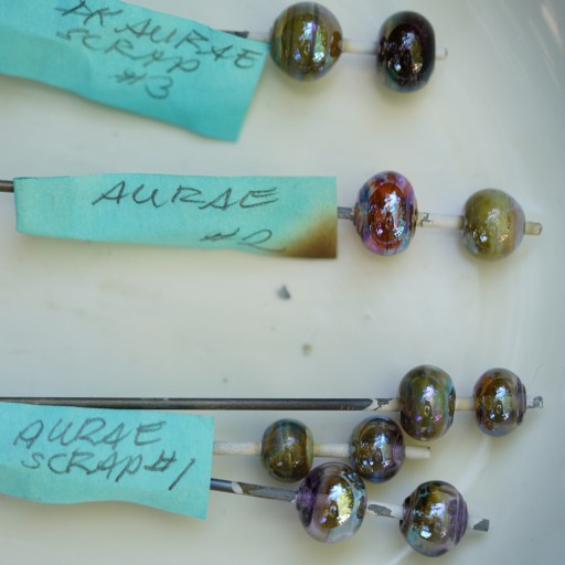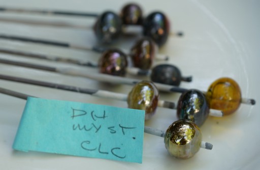 The first lot is DH mystery CLC[1] that I had lying around, and which as you can especially see on mandrels with two beads made from the same glass turned to gross blah (a term of art from my colour theory class;) when over-reduced.