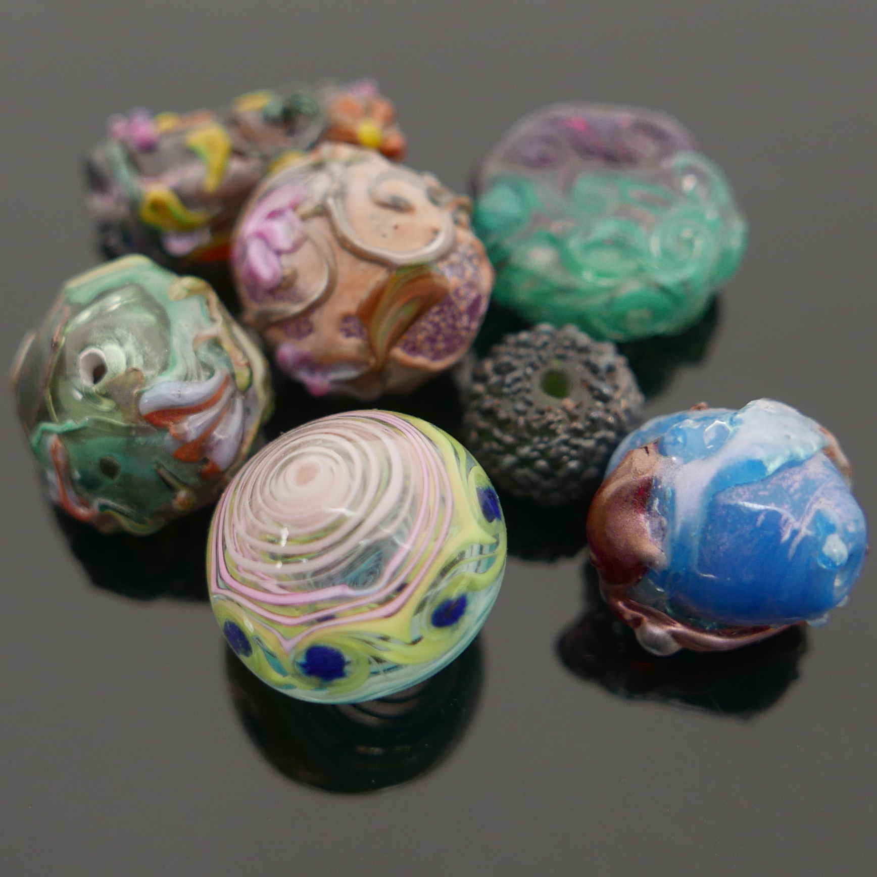 These beads have been sitting around in dishes and bowls in the studio as “inspiration”. It's kind of interesting to see what ideas I pursued (the florals) and which ones I didn't (the pixie dust on opaque) and which ones represent some of my earliest ideas (the filigrana stripey, definitely, and also the purple and green filigrana tessellation.)