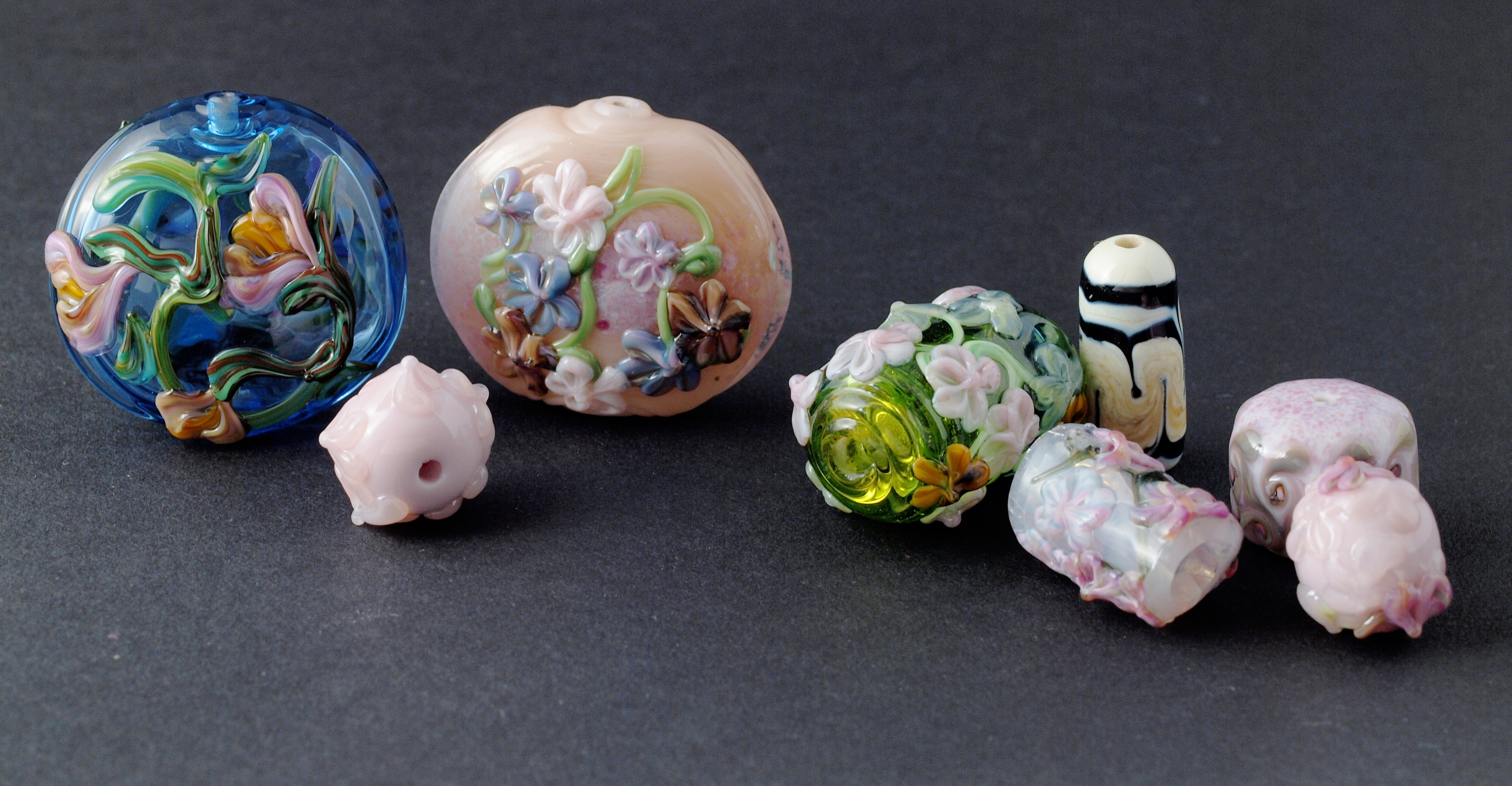 However, there are limits. The 1.5" lentil pressed pink floral, which was fine when it came out of the kiln a few days ago, has now cracked, and the crack follows the kugler raspberry frit—which along with seafoam green thompson enamel and tuquoise frit, make up the base color scheme. That's a bit much to ask of any opalino/alabastro type glass. The floral made on cirrus cracked completely. This, along with the crack in the leftmost bead in the bottom picture, are primarily a function of operator error—that is, I let the bead get too cold. And cirrus in particular is prone to cracking if not kept properly warm.
