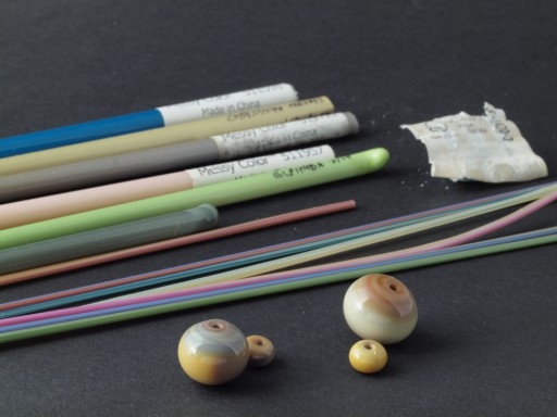 One of the things that CiM does well is translucents—so-called greasy glass. In Effetre, this would be your opalino and alabastro colors. The selection was pretty limited, and they weren't terribly popular; in addition to boiling and popping, they also were only marginally compatible. CiM, it must be said, has a lot of these, and they're much better behaved.