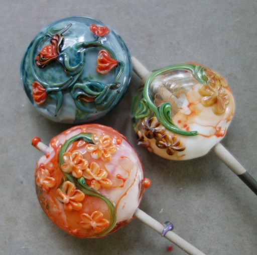 Three more-or-less pressed lentil beads. Top left: a greyish alt-lot of periwinkle, cased in palest aqua, with, um, silver blue frit; bottom left, white rolled in an TE orange pink, cased in trans 068 pink, decorated with shards made of a mix of coral and, er, ginger? and then floral trailed[2] ; right, clear and white base with more of the coral/ginger chards, trailed with canes made for the challenge.