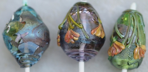 These three beads encompass a variety of experiments, one of which—making large hollow beads with no kiln—failed. —They all cracked. Le sigh.