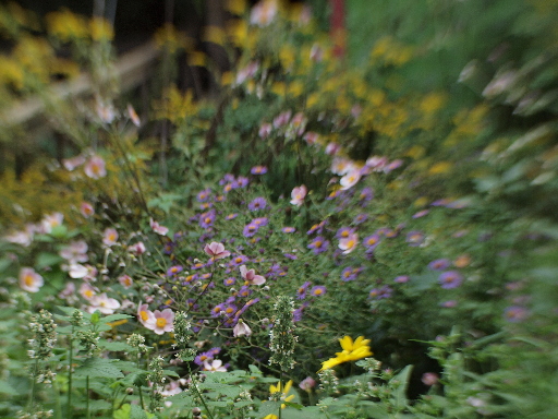 Catmint in the foreground in another that I entirely ripped out, despite its appeal to hummingbirds and all sorts of pollinators. Behind the mint there's Japanese anemone, goldenrod and some asters.