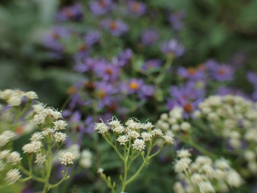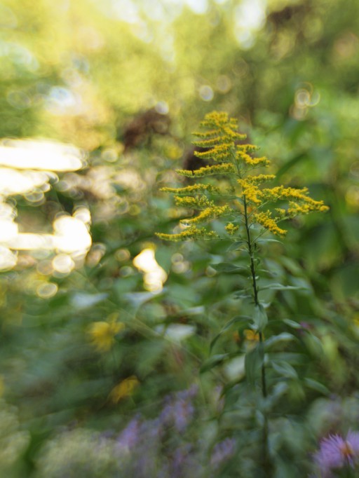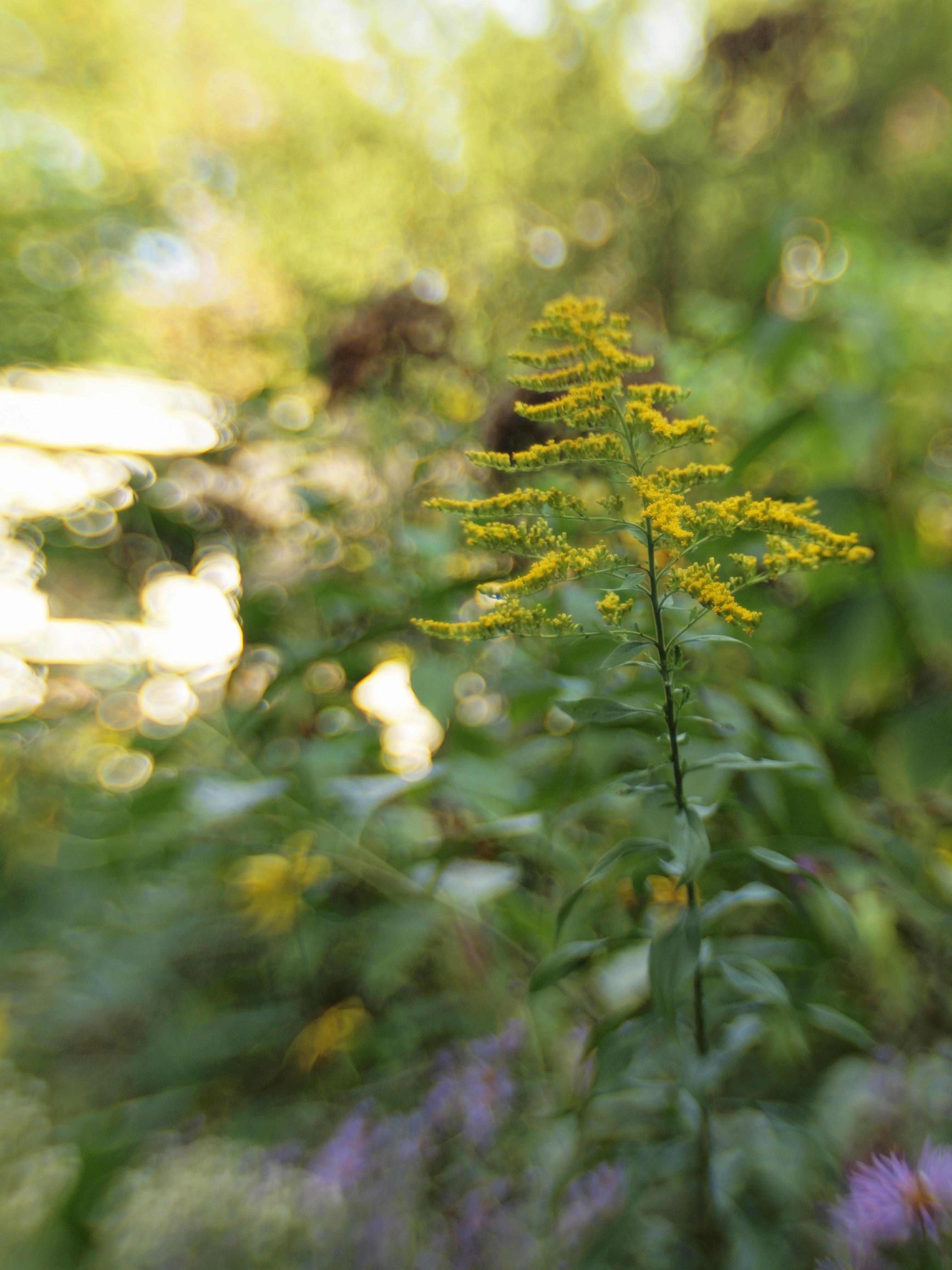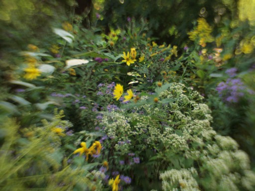 Olympus, lensbaby 21sep2017—perennial sunflowers & snakeroot, with purple asters & ironweed in the background, also goldenrod.