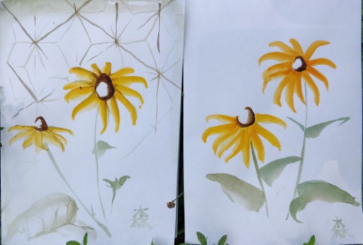 If I recall correctly, the notecards, made sometime on or before 8aug, were from flowers actually growing in f2tE's garden, but they were blooming at both houses—One of the reasons black eyed susans are so popular is their long—six weeks, typically—bloom season.