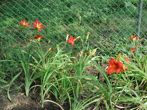 Here above you see the red portions of my haul freshly planted way back in 2002. (Or possibly replanted...)[1] But even here there are hints of trouble in paradise: (leaving aside the views from the side) the wide-petalled orangey red in the lower right has been lost to time; the one in the middle, only partially open, looks good; but the two on upper left, while they have good colour in the 3 ‘fore’ petals, the smaller back petals are not so vivid.