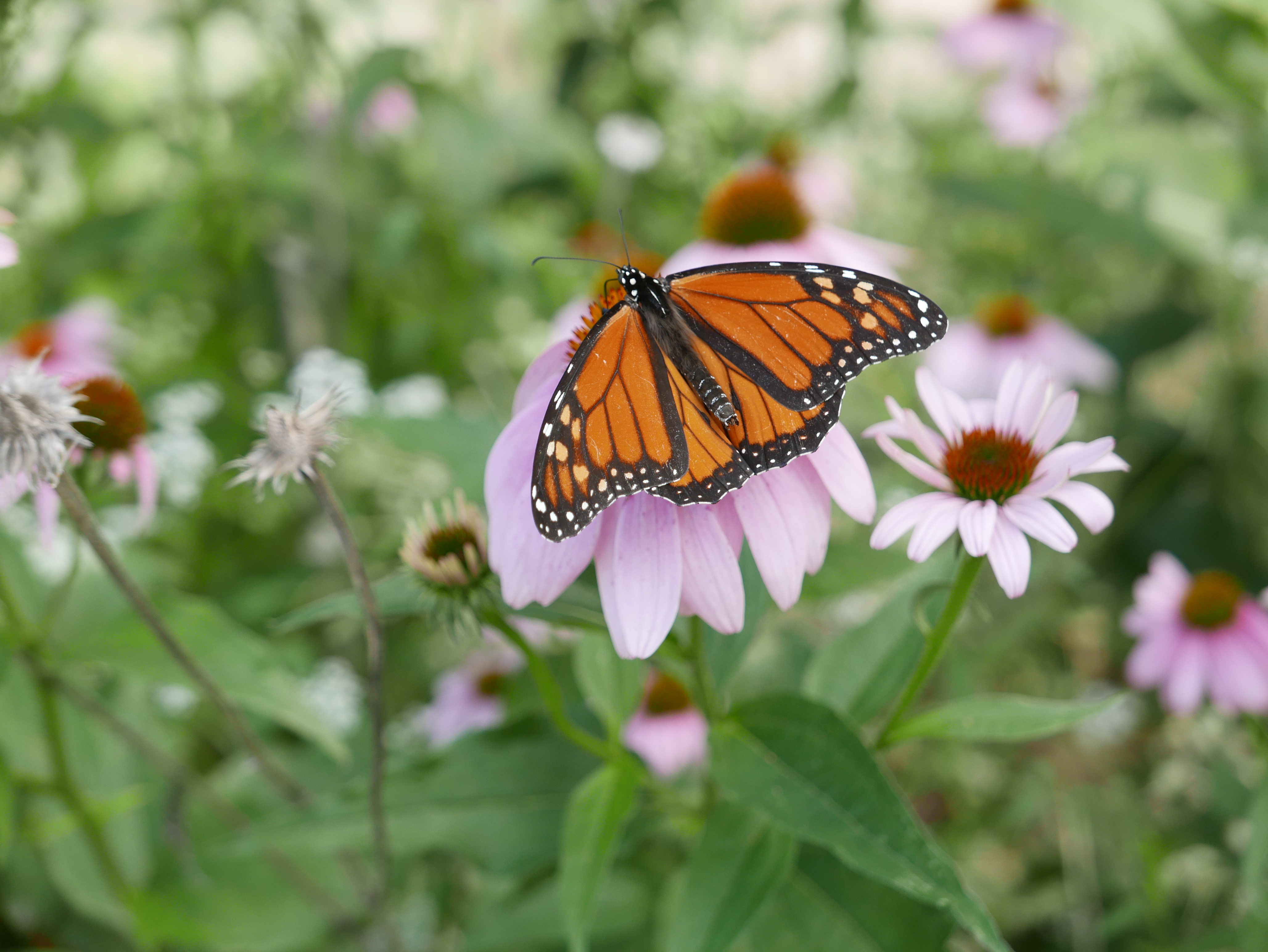 I now have a decent collection of milkweed plants for monarchs to lay their eggs upon, but this lot are male, and more interested n nectar. What could be more classic than a monarch on the native echinacea?