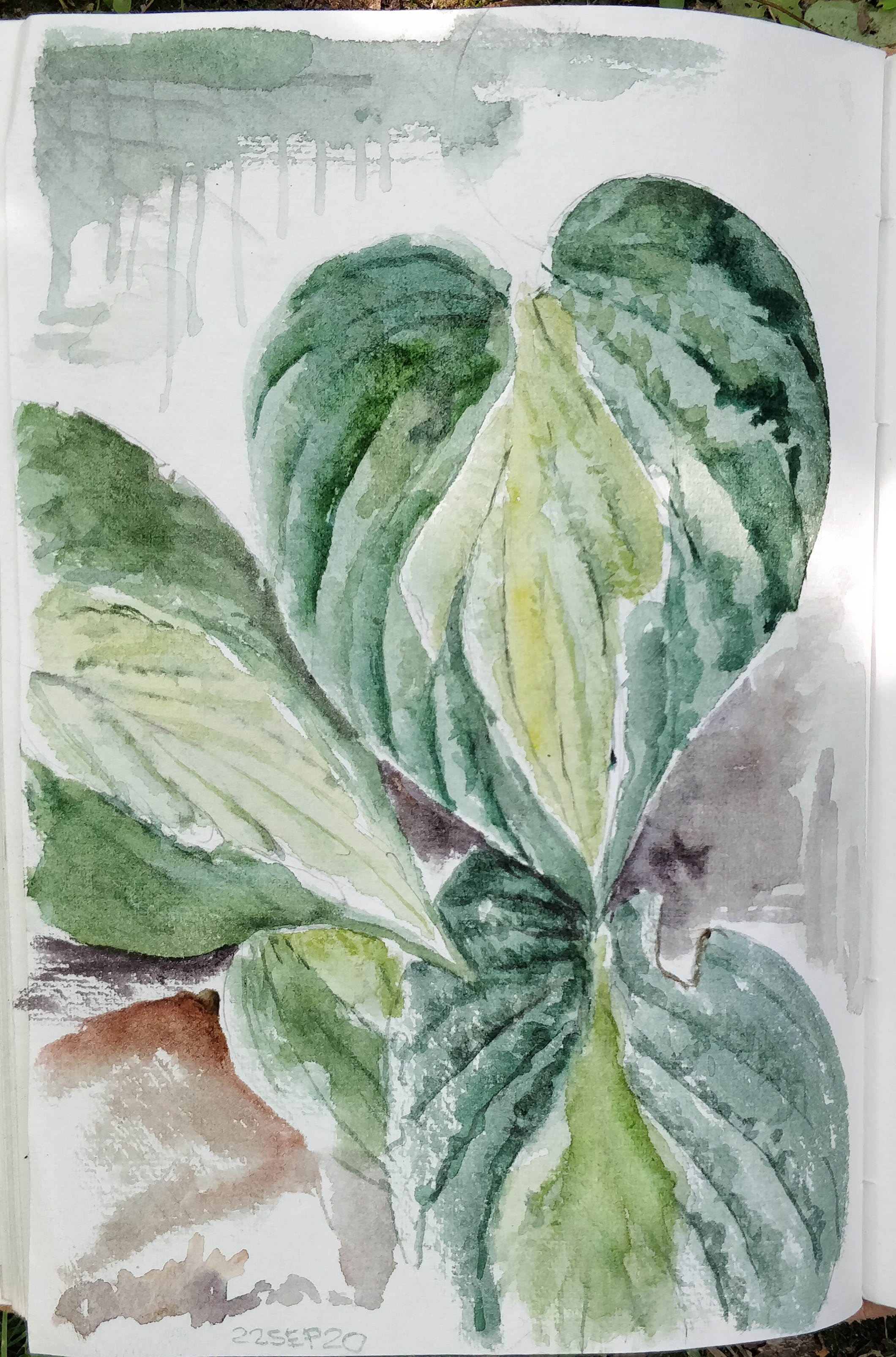 9.75 x 6.75 inches, leatherbound sketchbook; watercolour applied with brush pen,en plein air 22sep2020. Shot outdoors (hence that burnt out sun dapple on the right edge), cropped only. oneplus, 22sep2020.