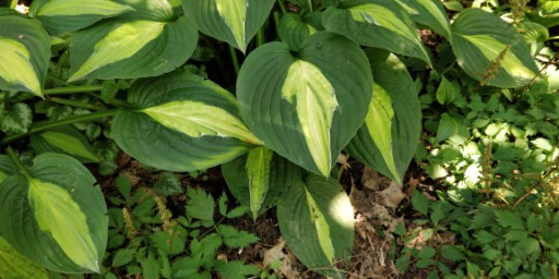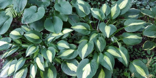 This shot, taken two days earlier in the evening, shows how differing light really shifts the colour; my eyes, of course, compensate a good deal more automatically than the camera. Off to the left you can just see the big blue hosta (& its fern leaf) that I attempted to depict yesterday.